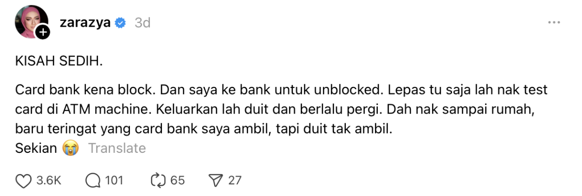Menerusi satu perkongsian di Threads, Zara berkongsikan kisah dimana dia ke bank untuk mengaktifkan kad miliknya dan mencubanya di mesin ATM, namun dia berlalu pergi tanpa mengambil wang.