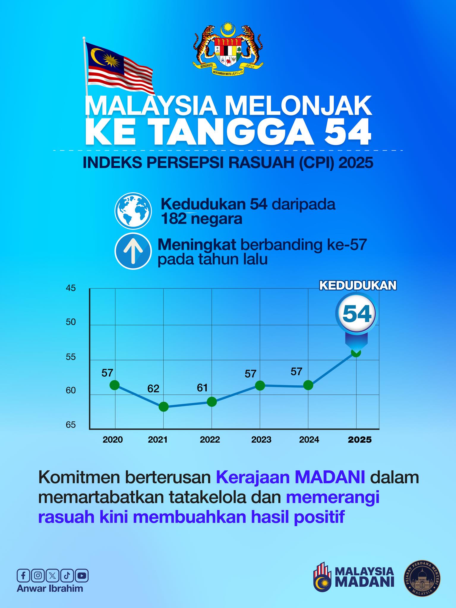 Kedudukan Malaysia dalam Indeks Persepsi Rasuah (CPI) dunia melonjak ke tangga ke-54, menunjukkan usaha Kerajaan MADANI dalam membanteras rasuah sistemik dan memperkukuh tadbir urus negara mula membuahkan hasil.