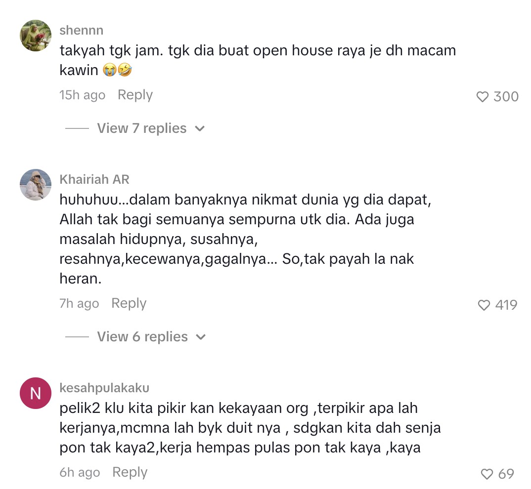 “Jam Nabila pakai RM250k korang. Padan lah open house fancy macam ni,” tulis individu berkenaan.