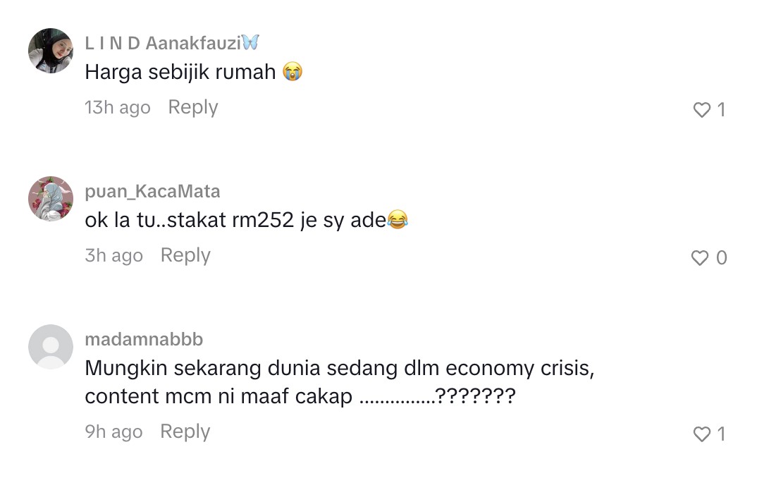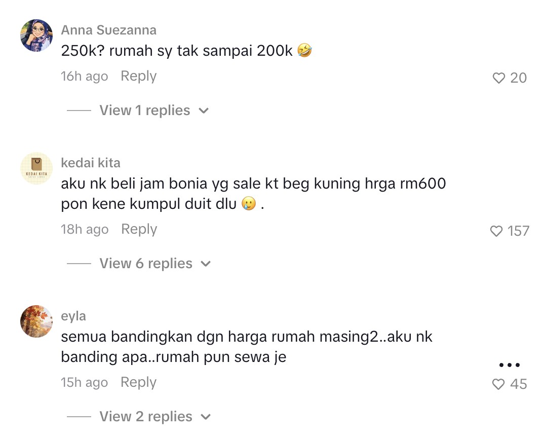 Pendedahan tersebut sekali lagi menghangatkan perbualan dalam talian, dengan rata-rata netizen meluahkan rasa kagum terhadap nilai serta kemewahan jam tangan berkenaan. Tidak kurang juga yang menjadikannya sebagai perbandingan terhadap kos hartanah, memandangkan nilainya yang menyamai harga sebuah kediaman.