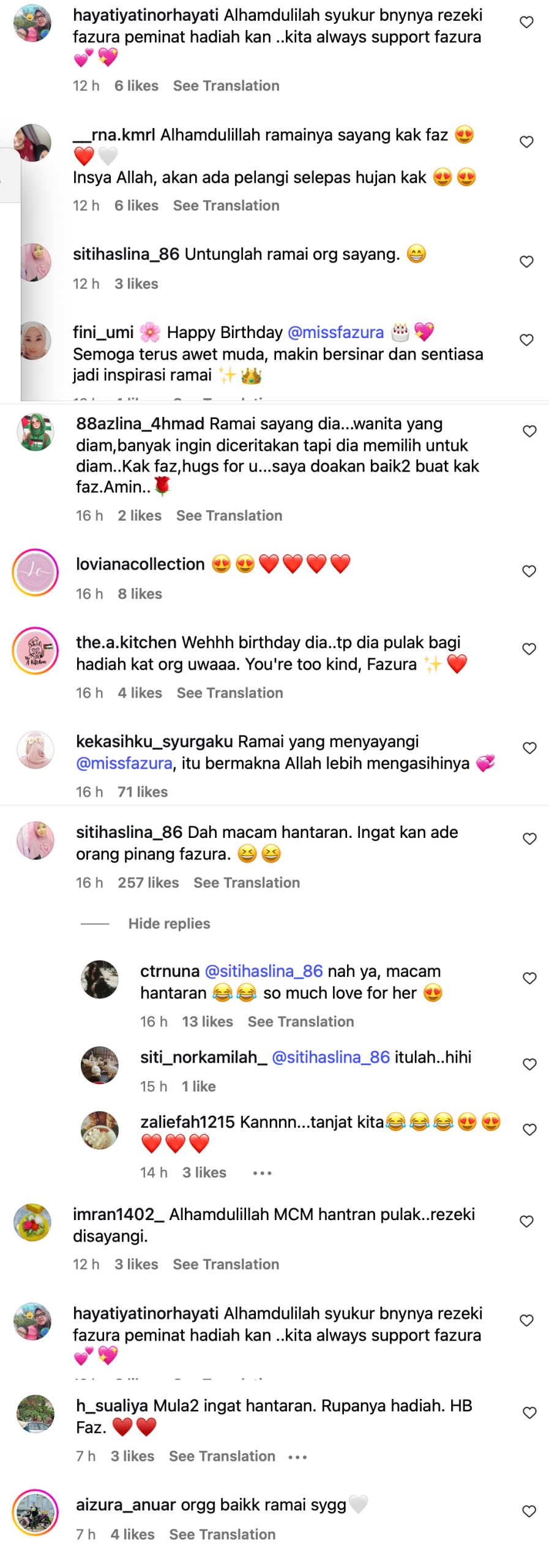 Diruangan komen, rata-rata netizen mengatakan Fazura dikelilingi ramai yang menyayanginya serta melihat ketenangan dan kebahagiaan di wajah pelakon itu.