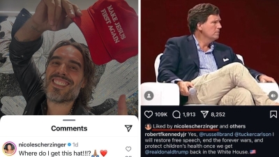 Brand’s hat was instead emblazoned with ‘Make Jesus First Again’ — the entertainer had recently become a born-again Christian while also being plagued with various sexual assault allegations.
