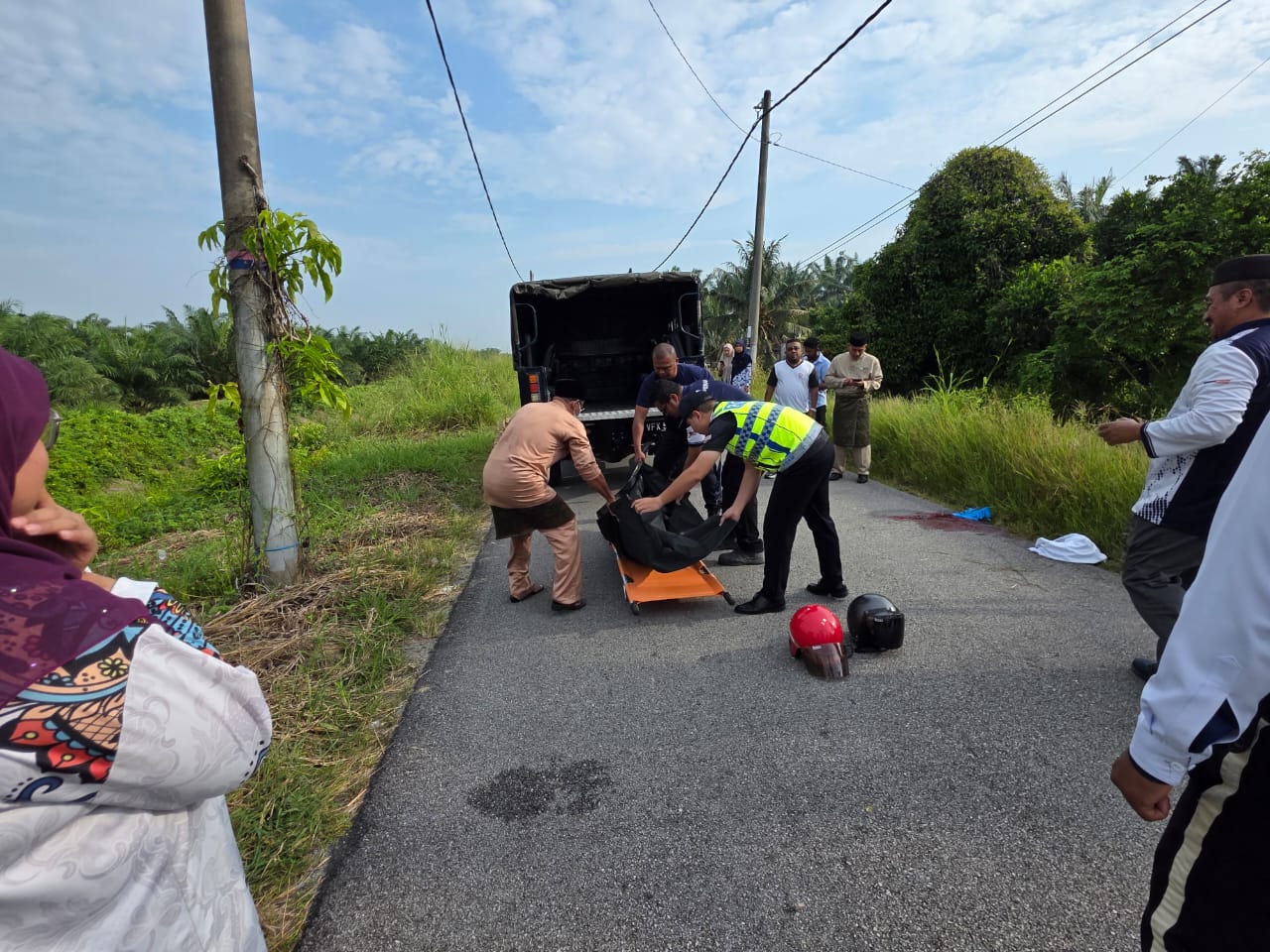 “Berdasarkan siasatan awal, kejadian dipercayai berlaku apabila sebilah sabit berhulu panjang yang dibawa oleh seorang lelaki telah terkena pada bahagian leher mangsa ketika kedua-dua motosikal berada berhampiran antara satu sama lain di atas jalan.