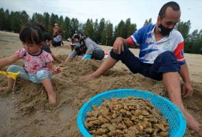 Pengunjung silih berganti membawa baldi atau beg plastik untuk mencari siput jenis belitung dan lala di sepanjang pantai berkenaan sejak 2 petang.
