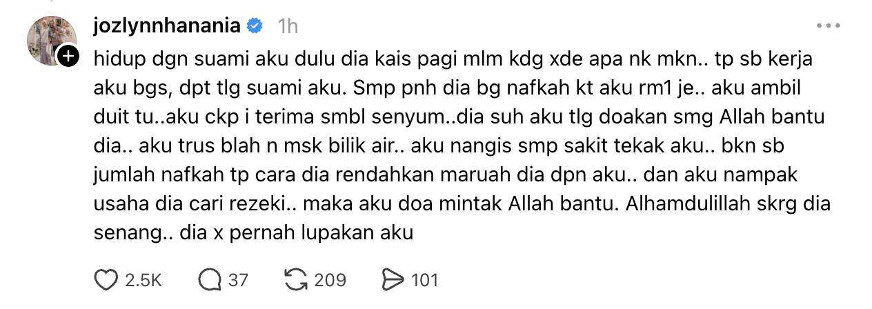 “Bukan sebab jumlah nafkah, tapi cara dia ‘rendahkan’ diri dia depan saya, dan saya nampak usaha dia cari rezeki. Saya terus masuk bilik air dan menangis sampai sakit tekak,” kongsinya.