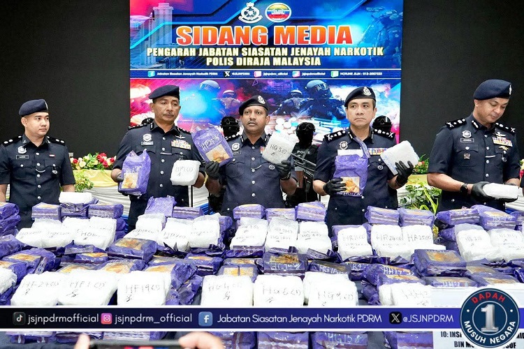Polis menahan lima suspek termasuk pasangan suami isteri dan merampas 510 kilogram dadah jenis methamphetamine bernilai RM25.5 juta menerusi tiga serbuan di sekitar Wang Kelian, Padang Besar, Perlis minggu lalu.