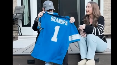 The influencer and podcaster hands her dad a blue football jersey that read “Grandpa” and the number 1, as well as a sonogram image, as Eminem’s jaw drops and eyes widen, tearing up at the happy news.