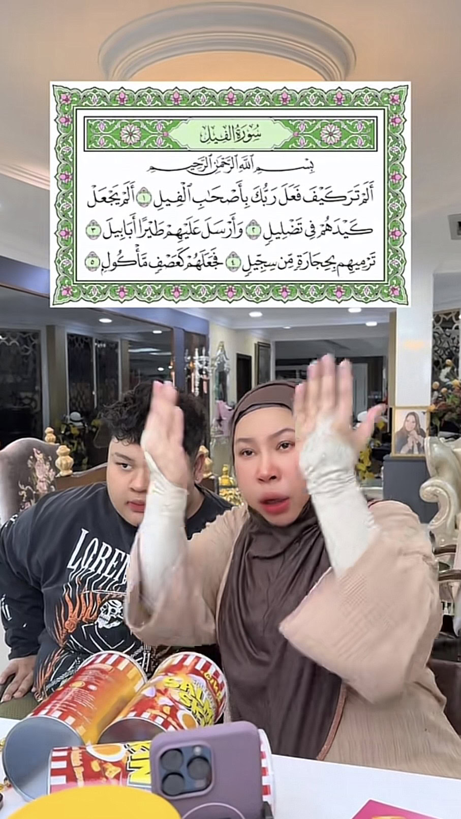 “Baca Alam tara kaifa fa’ala rabbuka bi-as-hābil fīl, baca tiga kali insya-Allah tuhan bukakan pintu langit untuk kita, angkat doa dan diberi rezeki yang tak dijangka, rezeki yang tidak luak serta rezeki barakah,” kata Vida, di TikTok.