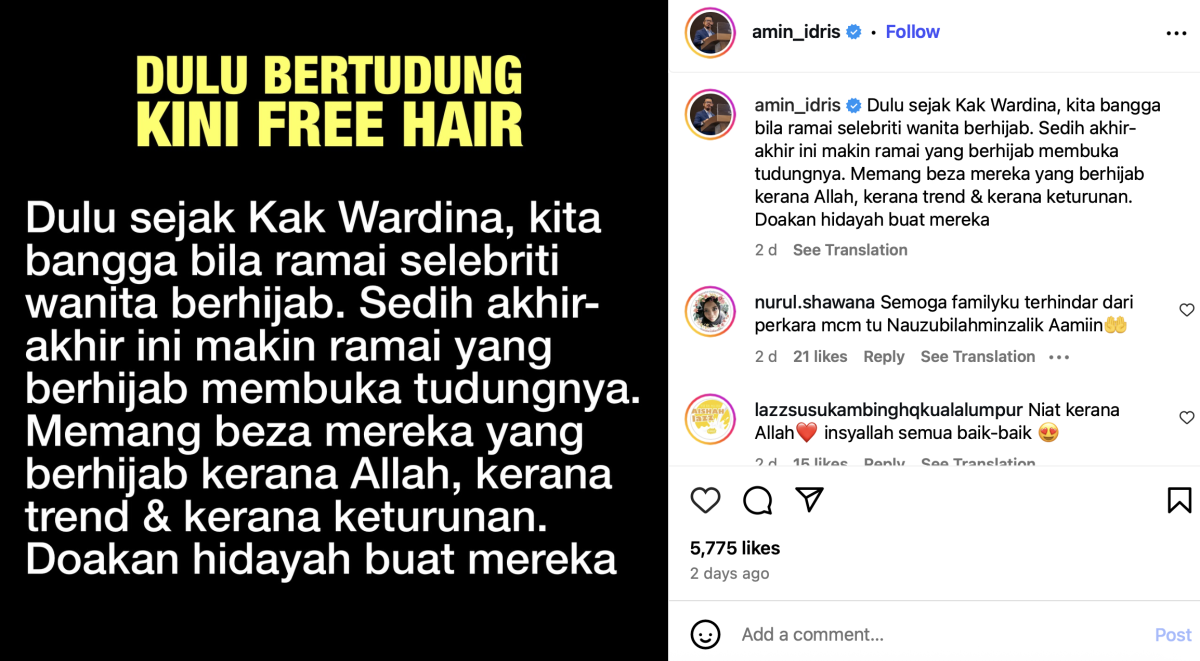 Sementara itu, Amin tetap mendoakan mereka yang membuka tudung supaya mendapat hidayah daripada Allah. Bagaimanapun, Amin tidak merujuk perkongsian tersebut kepada mana-mana pihak.