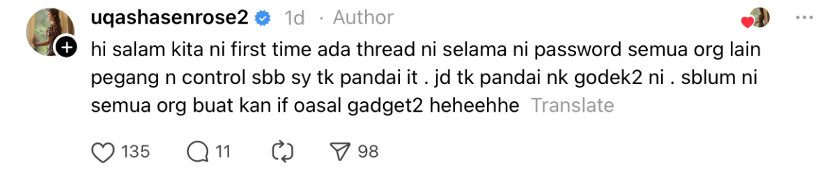 “Hi salam kita ni pertama kali ada Threads ini. Selama ini password semua orang lain pegang dan kawal sebab saya tak pandai IT.