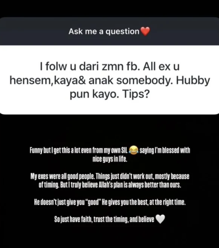 “Hakikatnya, bekas kekasih saya semuanya orang baik. Cuma tiada jodoh, kebanyakannya sebab faktor masa. Tapi saya percaya, perancangan Allah sentiasa lebih baik daripada apa yang kita rancang.