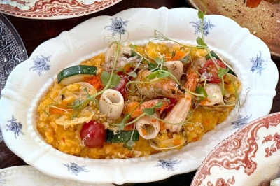More than simply kimchi meets risotto, the sweet seafood flavours of prawns, squid and clams deepen the dish, alongside the use of pumpkin, zucchini, cherry tomatoes and Parmesan cheese to add substance and zing.