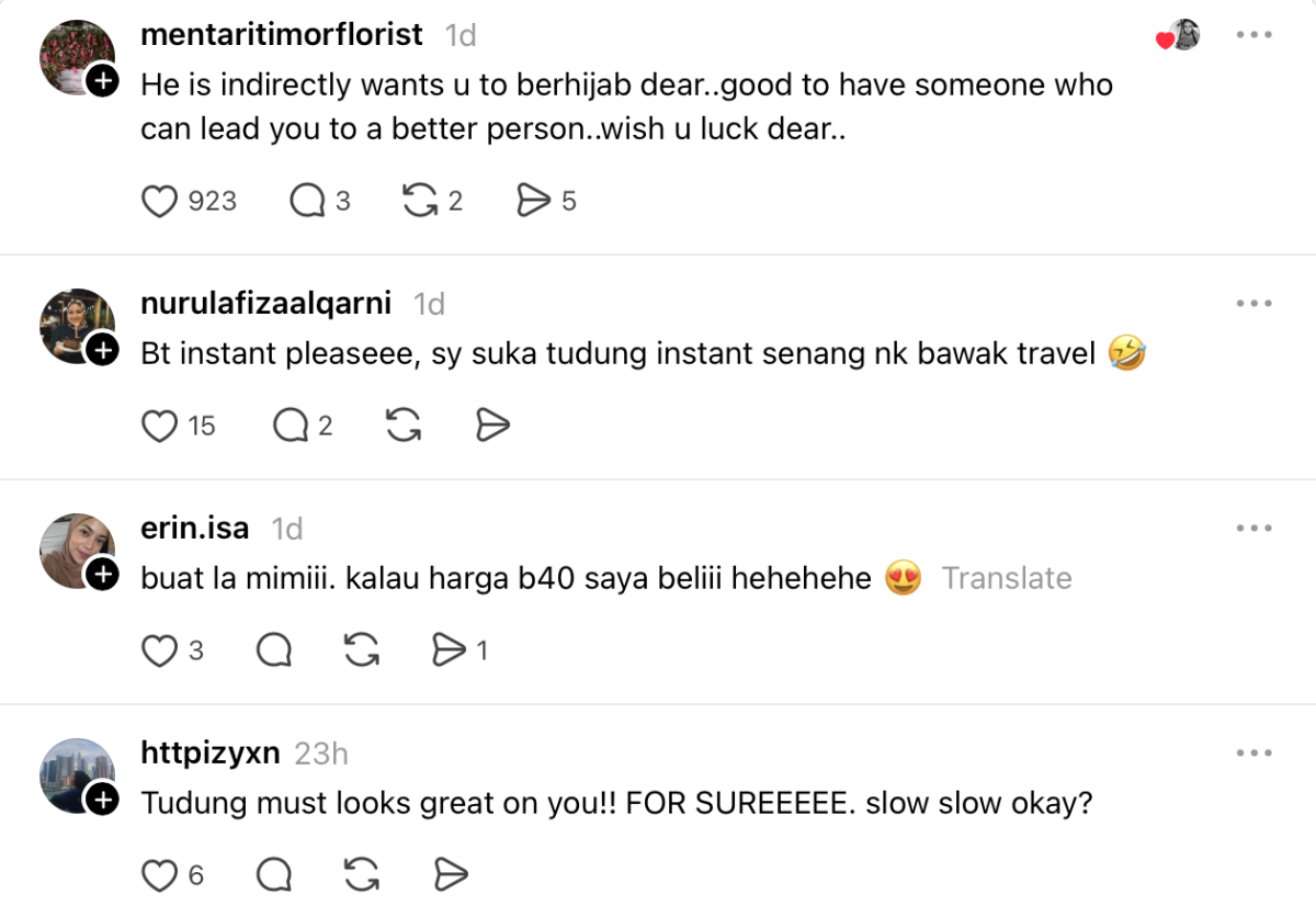 “Tapi takut sebab risau tak kena dengan citarasa orang yang bertudung. Tahun depan saya cuba lagi, mudah-mudahan,” katanya.