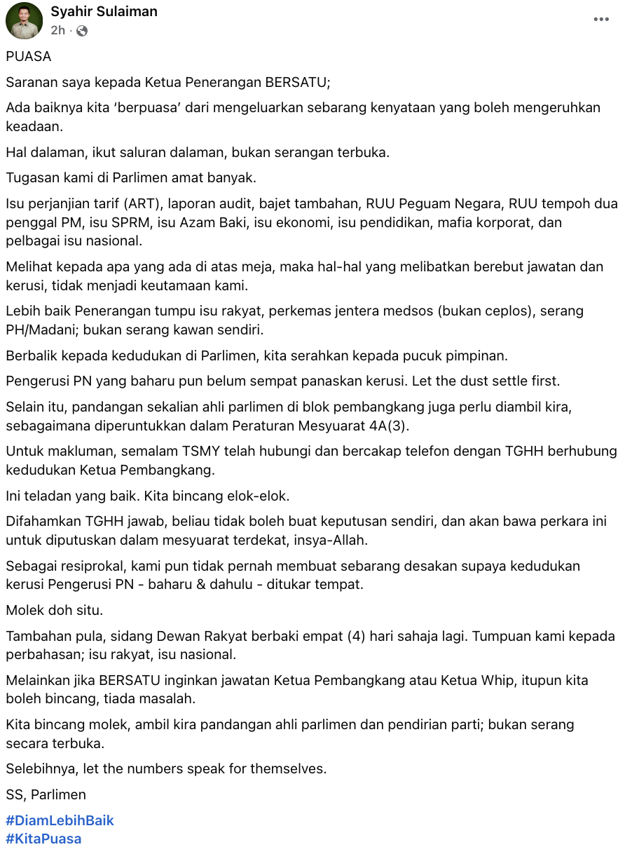 Menerusi kenyataan dibuat di Facebook, Syahir yang juga ahli parlimen Bachok, menegaskan bahawa perkara berkaitan kedudukan jawatan dan struktur organisasi dalam blok pembangkang sepatutnya diselesaikan melalui saluran dalaman, bukan media.