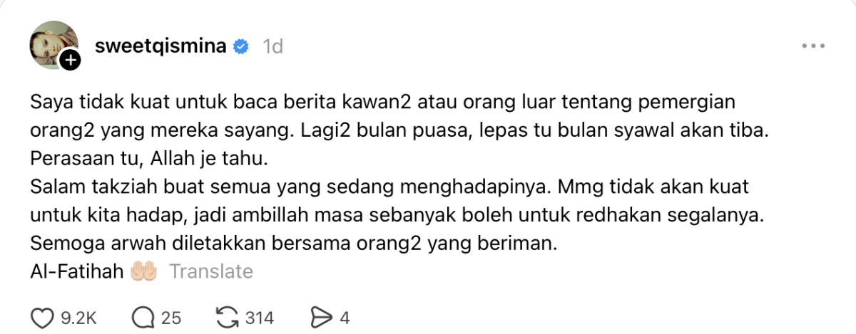 “Salam takziah buat semua yang sedang menghadapinya. Memang tidak akan kuat untuk kita hadap, jadi ambillah masa sebanyak boleh untuk redhakan segalanya. Semoga arwah diletakkan bersama orang-orang yang beriman,” tulisnya.