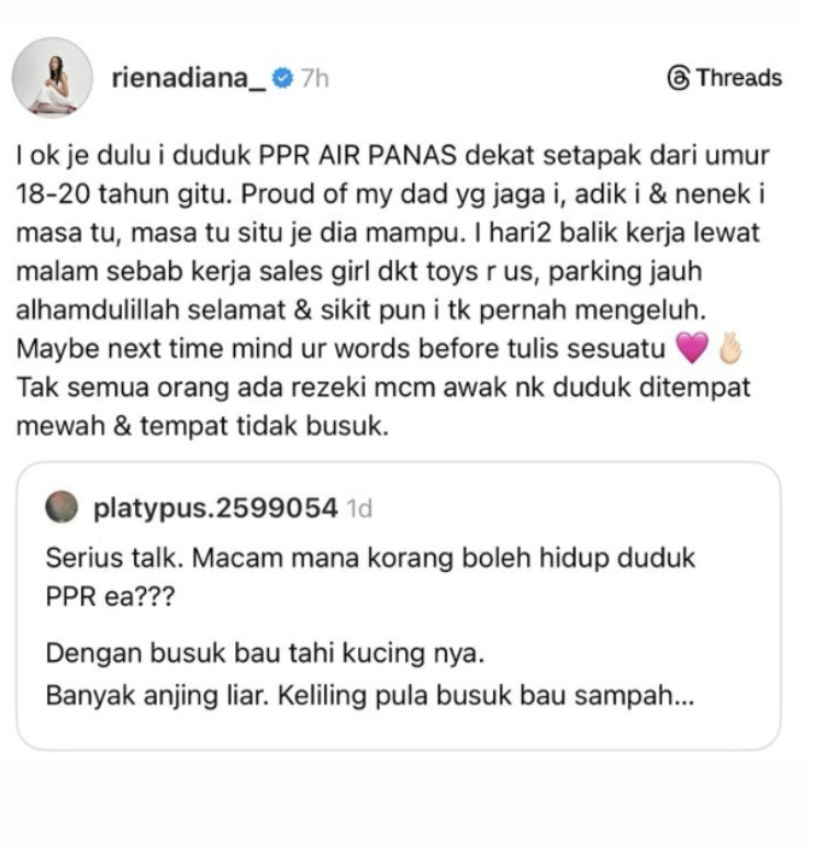 Dalam pada itu, Riena turut menegur individu berkenaan supaya berfikir dahulu sebelum menulis sesuatu kerana tidak semua orang diberikan rezeki hidup di tempat mewah.