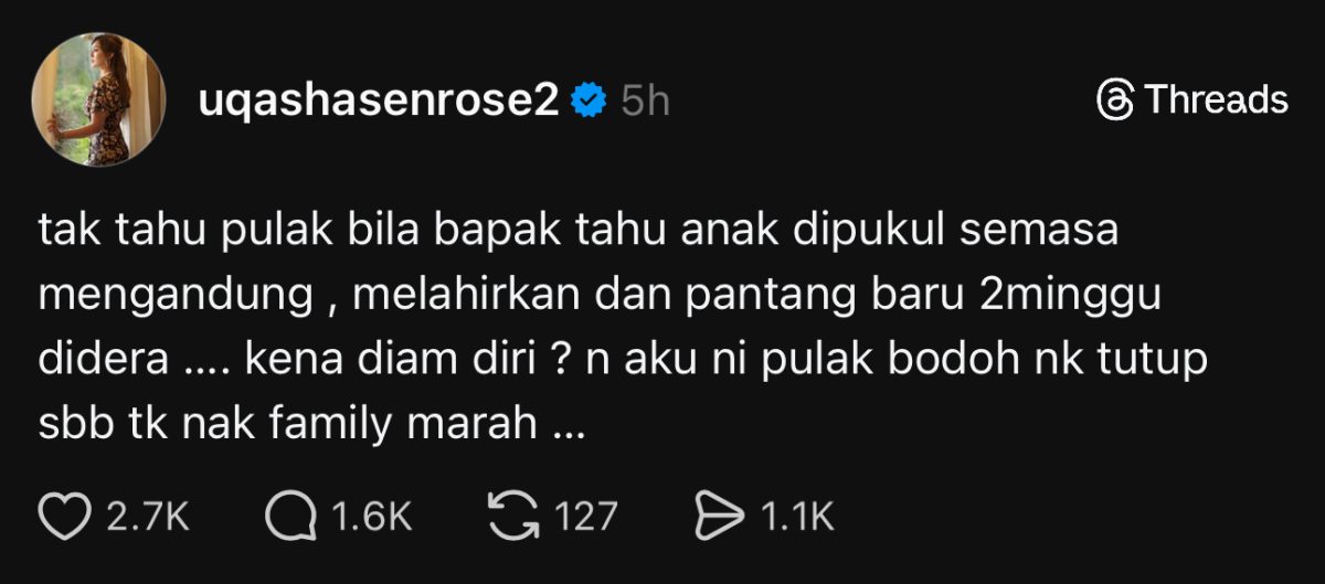 “Tak tahu pula bila bapa tahu anak dipukul semasa mengandung, melahirkan dan pantang baru dua minggu didera, kena diam diri,”tulisnya.