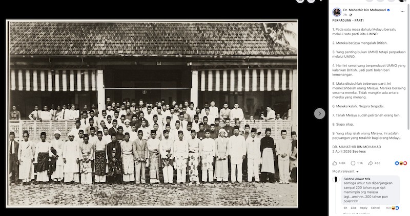 Terdahulu, Dr Mahathir menegur orang Melayu kerana membiarkan politik mereka terus berpecah dengan penubuhan banyak parti berteraskan kaum itu.