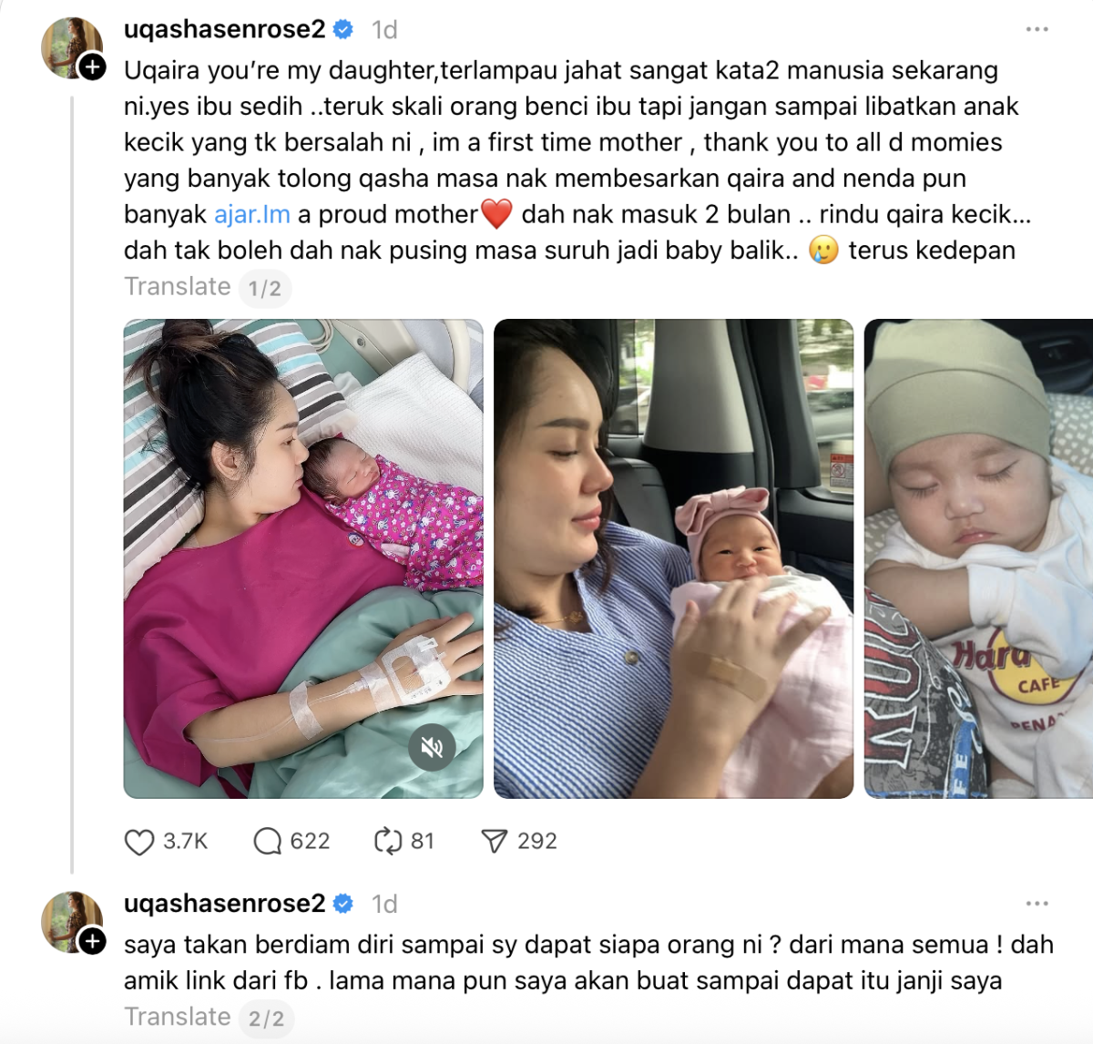 “Saya baru pertama kali jadi ibu. Terima kasih kepada semua ibu yang banyak bantu Qasha dalam membesarkan Qaira. Nenda pun banyak ajar. I’m a proud mother.