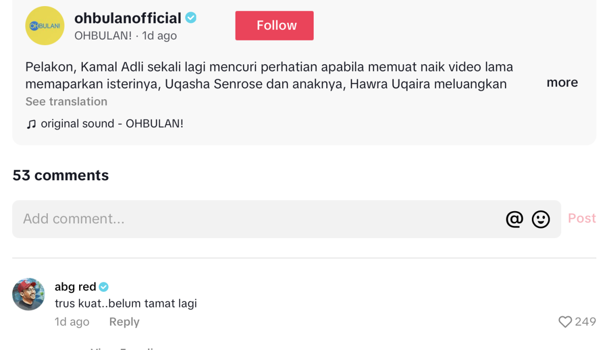 Video tersebut turut dimuat naik semula portal Oh Bulan di TikTok sekaligus membuatkan ramai sebak melihat keluarga kecil itu serta berharap semuanya akan kembali baik seperti sediakala.