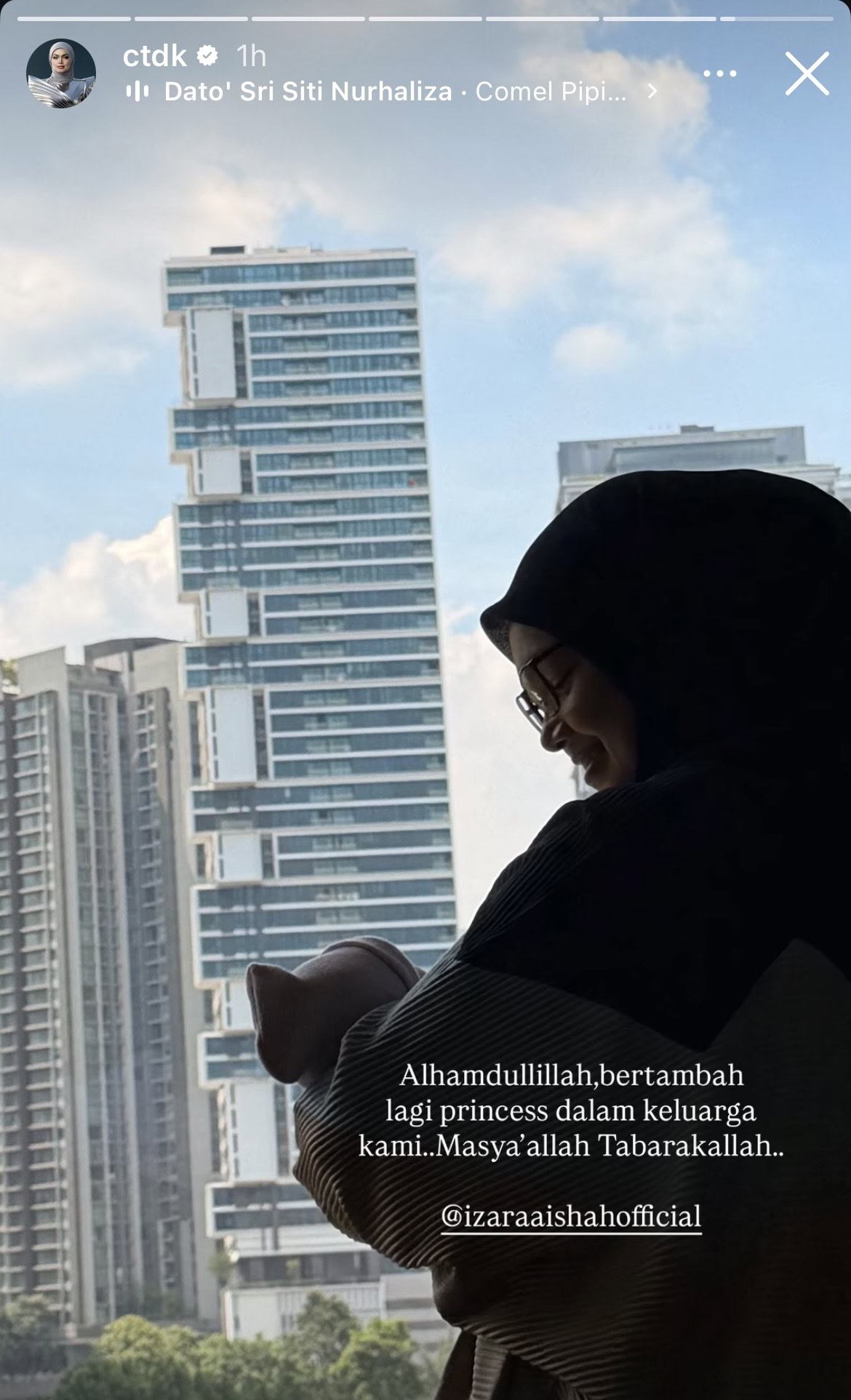 Berita gembira itu turut dikongsikan oleh penyanyi tersohor, Siti Nurhaliza yang juga merupakan ibu mentua kepada Izara, sekali gus menzahirkan rasa syukur dan bahagia atas kelahiran ahli baharu dalam keluarga mereka.