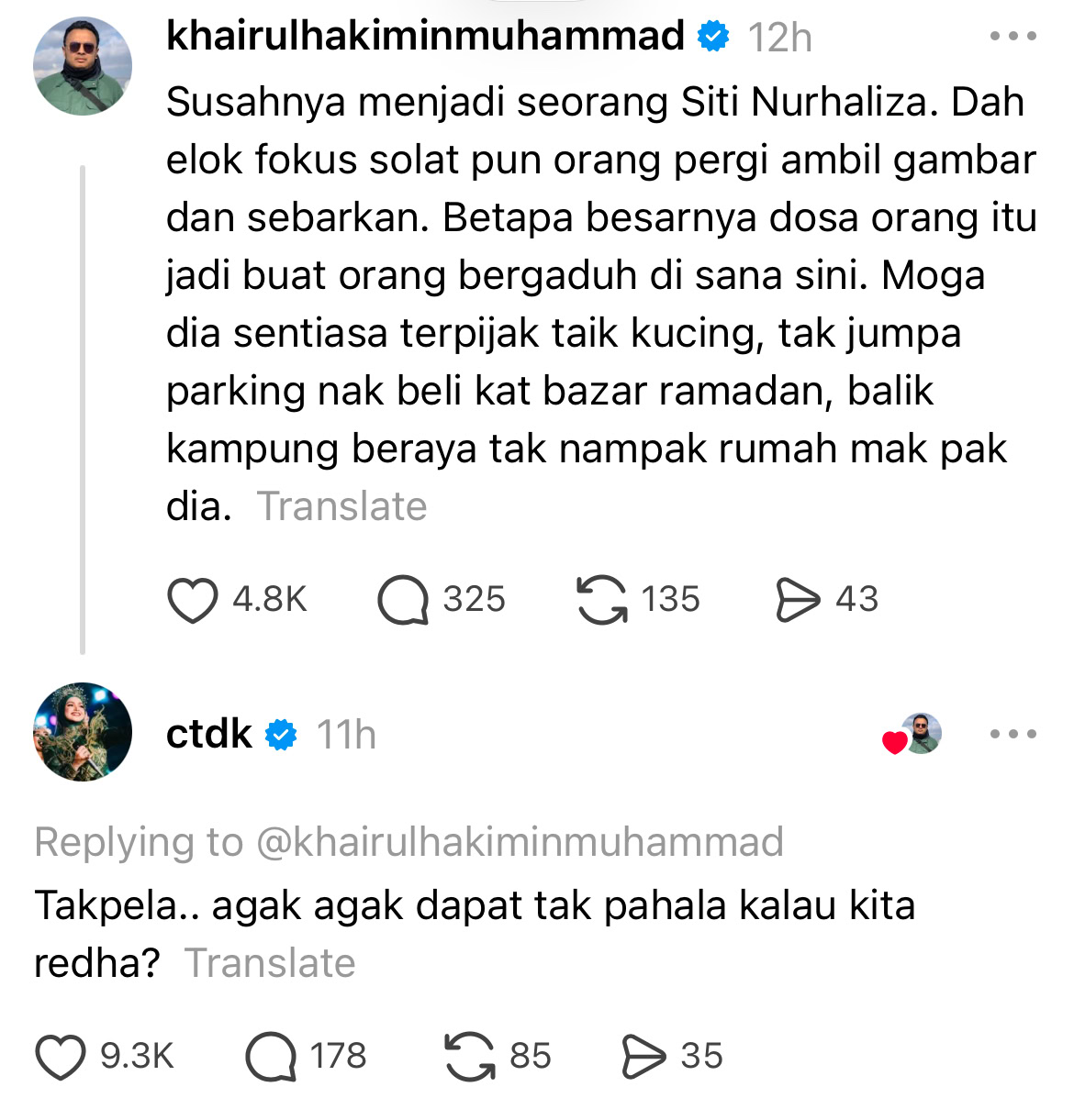 Menerusi perkongsian di Threads, seorang usahawan dan pempengaruh media sosial, Khairul Hakimin, menyelar tindakan individu yang merakam foto penyanyi itu ketika sedang beribadah sebelum menyebarkannya di media sosial. Menurutnya, perbuatan tersebut bukan sahaja tidak beradab, malah menjadi punca perbalahan.