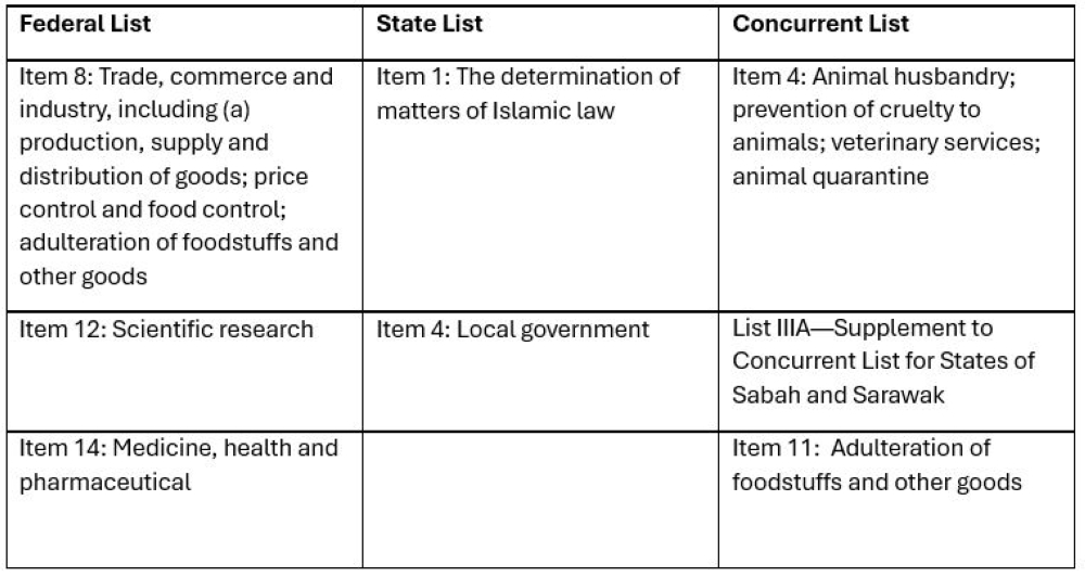 A study of the Lists — List I, List II, List IIA, List III and List IIIA — shows that Halal matters may fall under List I (Federal List), List II (State List), List III (Concurrent List) and List IIIA (Supplement to Concurrent List for Sabah and Sarawak).
