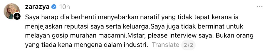 Zara turut berharap agar segala gosip dan naratif tidak benar ini dihentikan kerana ia boleh menjejaskan reputasi serta keluarga.