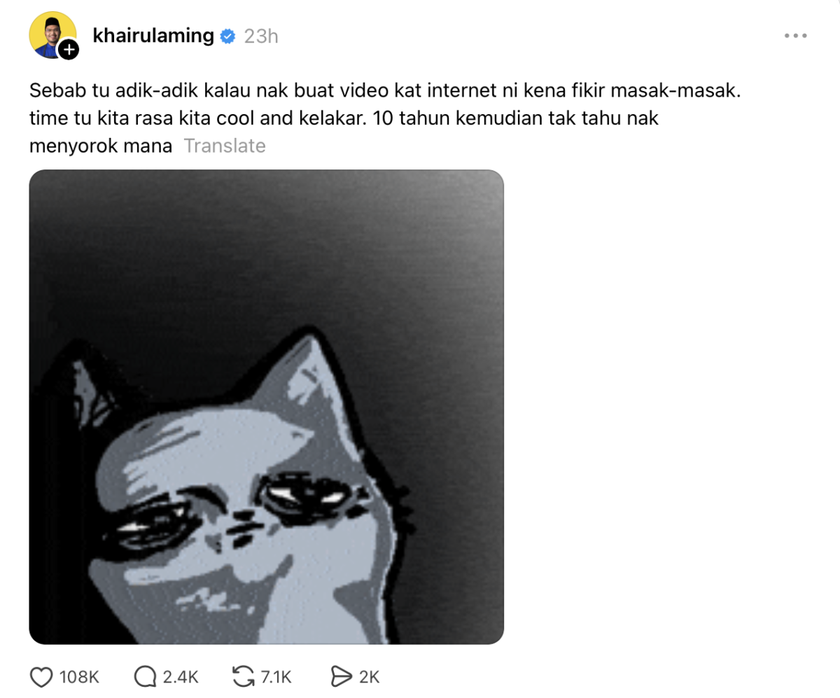 Perkongsian pempengaruh media sosial, Khairul Aming menjadi perhatian apabila menitipkan pesanan kepada anak-anak muda untuk berfikir masak-masak sebelum memuat naik konten di media sosial.