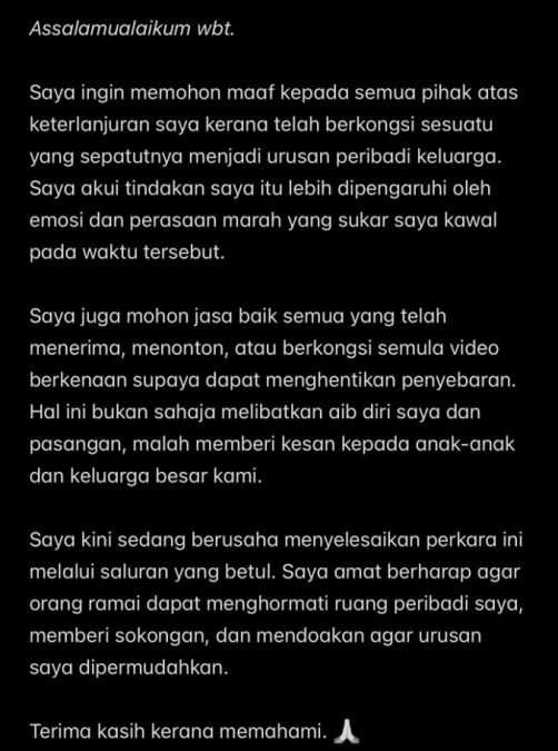 Hal ini bukan sahaja melibatkan aib diri saya dan pasangan, malah memberi kesan kepada anak-anak dan keluarga besar kami.- Jelasnya dalam hantaran itu.