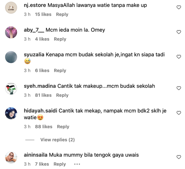 Tidak kurang juga, ada yang mengatakan Watie dilihat lebih muda tanpa solekan, malah ada yang berpendapat isteri Shuib itu seperti budak sekolah.