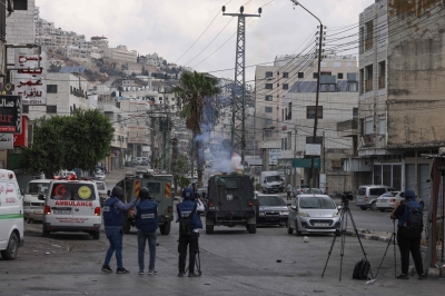 Reporters take images of Israeli military vehicles conducting a raid at the Balata refugee camp, east of Nablus, in the occupied West Bank on October 1, 2024. Italian media, much like its counterparts across Europe, frequently presents a binary narrative when covering Israel. Israel is portrayed as a ‘victim’ of history, deserving sympathy for its role in major historical events such as the Holocaust, writes the author. — AFP pic