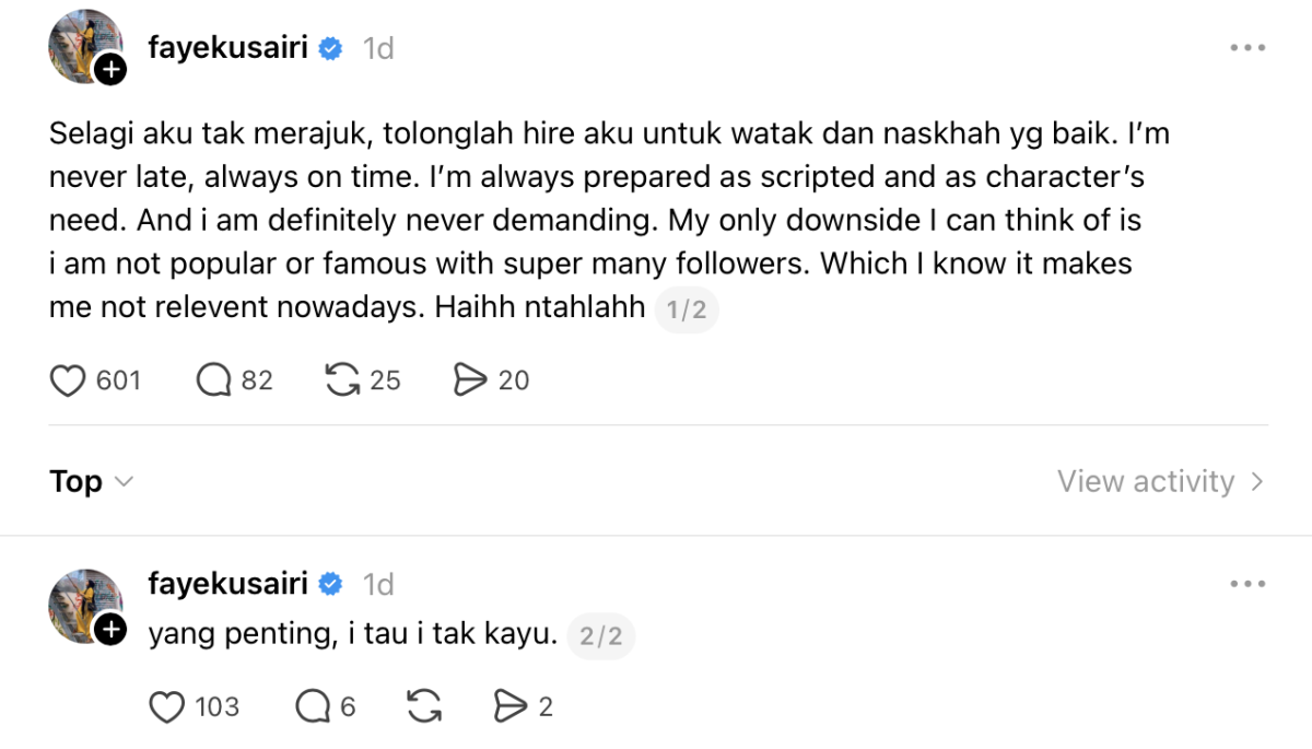 Pelakon Faye Kusairi dilihat memuat naik hantaran mempromosikan di media sosial Threads untuk mendapatkan tawaran berlakon dalam naskhah berkualiti.
